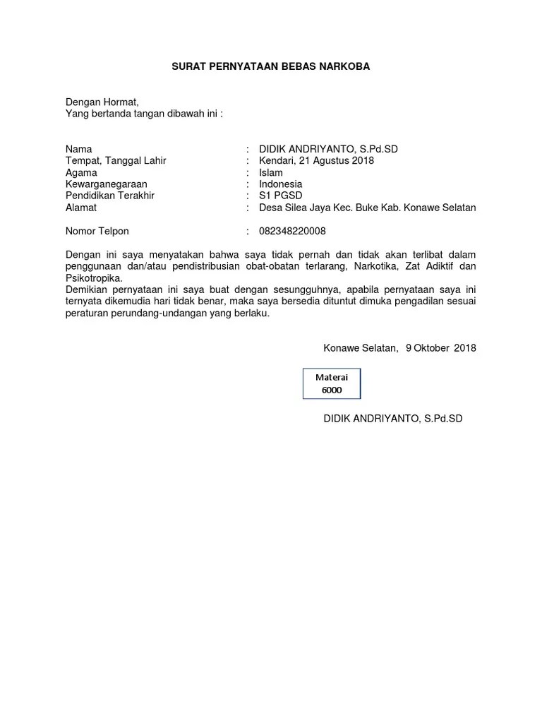Contoh surat pernyataan bebas narkoba cpns kementerian agama 2018 ini sebagai persyaratan administrasi mengikuti seleksi cpns 2018 kemenag.